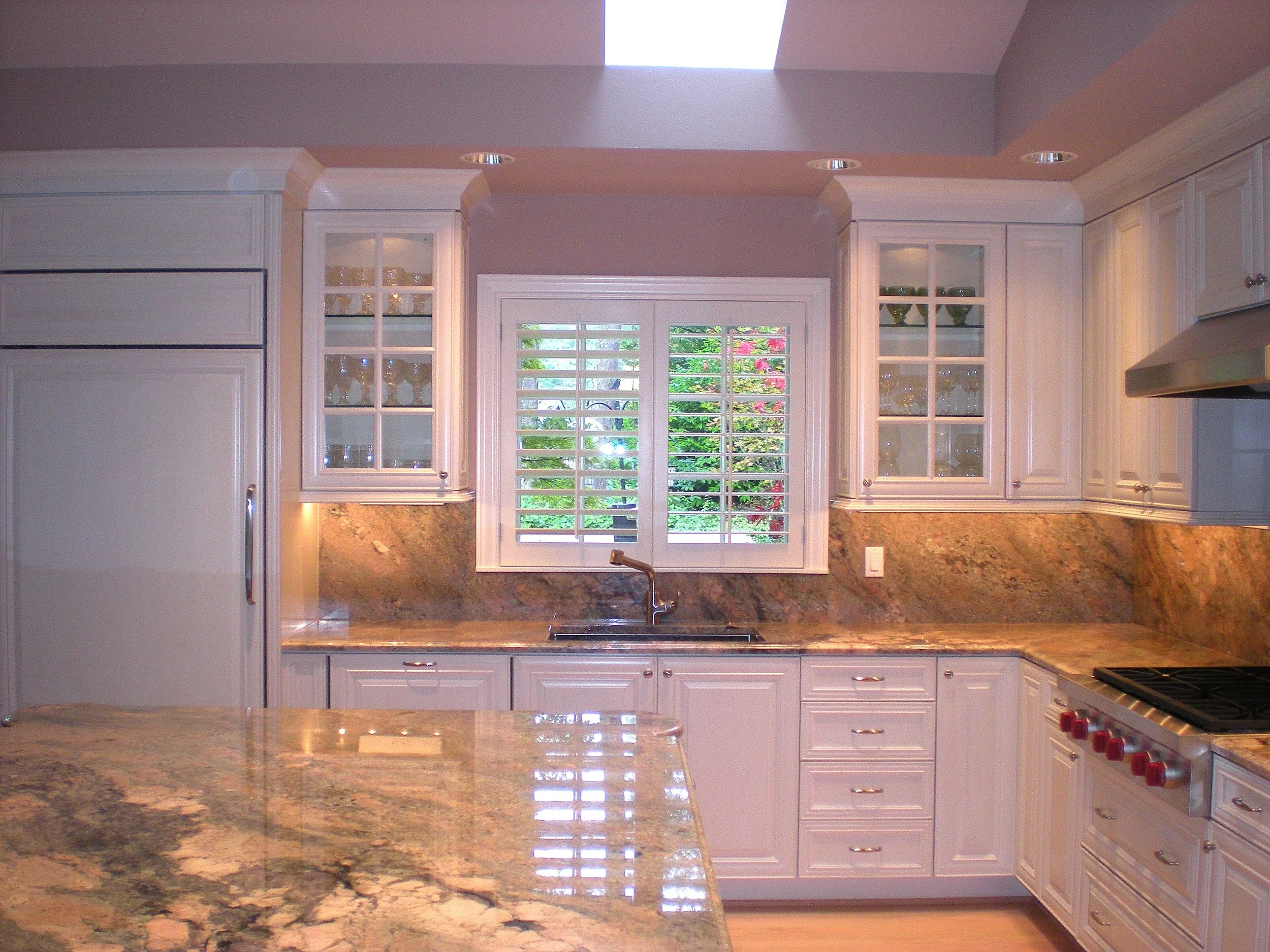 Shutters can be a stylish yet practical window treatment for kitchens, offering privacy, superb light control, and are easy to clean. There are a variety of shutter styles that will work in kitchen windows. Planation shutters have larger louvers and are exceptional at offering plenty of light. Cafe shutters are a good choice if you only need privacy in the lower half of the window. Tier-on-Tier shutters offer separate top and bottom panels that can be independently opened, providing flexible light and privacy control. Give us a call today to receive a complimentary design estimate.